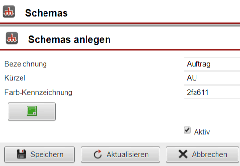 Um ein Vorgangsschema anzulegen, klicken Sie im Hauptmenüpunkt „Einstellungen“ auf „Vorgänge“ und im sich darauf öffnenden Fenster auf „Schemas“. Über den Button „anlegen“ in der Untermenüleiste der Schemaübersicht können Sie hier ein weiteres hinzufügen. Bei der Anlage eines neuen Vorgangsschemas definieren Sie zuerst dessen Grunddaten. Diese bestehen aus dessen Bezeichnung, einer Abkürzung für die Bezeichnung und der Farbe, in der Vorgänge dieses Schemas zukünftig angezeigt werden sollen. Über die Option „Aktiv“ können Sie später bei Bedarf das Schema für den Gebrauch komplett deaktivieren. Speichern Sie Ihre Eingaben abschließend über die gleichnamige Schaltfläche am Ende der Maske ab.