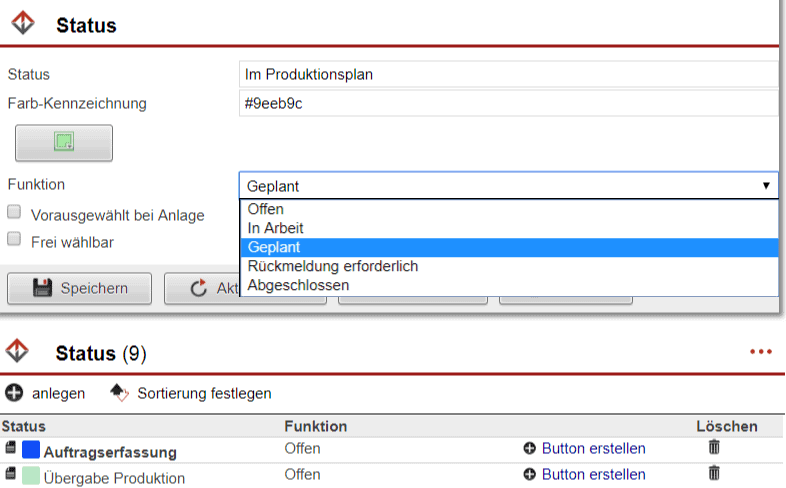 - Funktion: Tragen Sie hier zur besseren Differenzierung ein, welchen arbeitstechnischen Hintergrund der Status hat. Es sind fünf einheitliche Angaben wählbar, beispielsweise würde beim Status „In Produktion“ die Angabe „In Arbeit“ am besten passen.