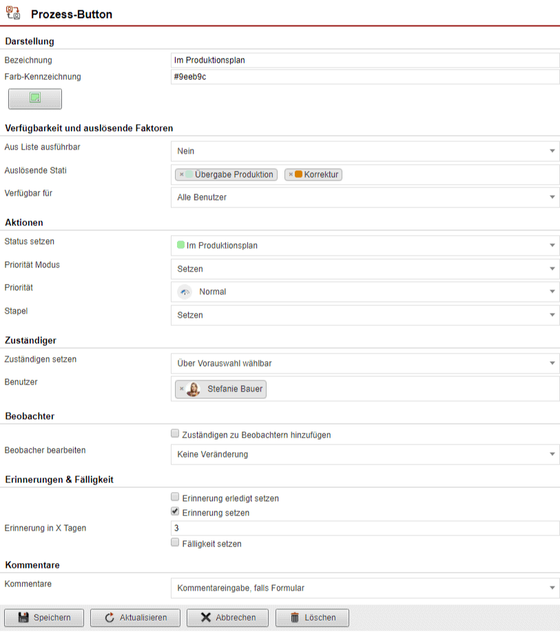 Weiterhin können Sie in dieser Maske den jeweiligen Status und die entsprechenden Prozess-Buttons bestimmen.