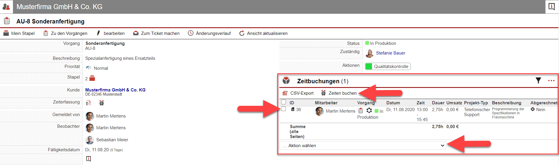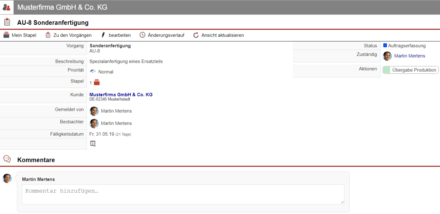 Im in den Abbildungen dieses Artikels durchgespielten Beispielfall ist dies „Mustermann GmbH & Co. KG AU-8 Sonderanfertigung [id-10]“.