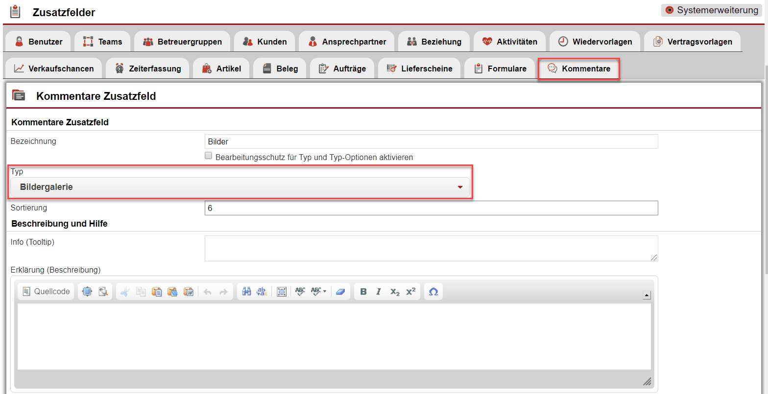 Auch weitere Zusatzfelder können Sie jederzeit ergänzen. Mithilfe der Schnellsuchzeile öffnen Sie die den Einstellungsbereich „Zusatzfelder“. Hier klicken Sie auf den Reiter „Kommentare“. Legen Sie nun wie gewohnt Ihr gewünschtes Zusatzfeld an. Dabei haben Sie die Möglichkeit, zwischen den Typen „Text“, „Zahlen“, „Dateiupload“ und „Bildergalerie“ zu wählen. Hier erfahren Sie weitere Informationen bzgl. der Zusatzfelder: „Die Zusatzfelder“.