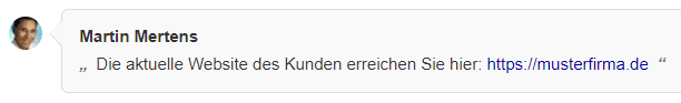 Gehen wir als Beispiel davon aus, dass Sie als Mitarbeiter einer Webdesign-Firma den Kollegen die verbesserungsbedürftige Website eines Auftraggebers im Vorgang hinterlegen wollen. Hierfür tragen Sie im Kommentar einen Hinweis auf https://www.musterfirma.de ein. Geben Sie dagegen nur www.mustermann.de oder mustermann.de ein, so funktioniert die automatische Verlinkung jedoch nicht.