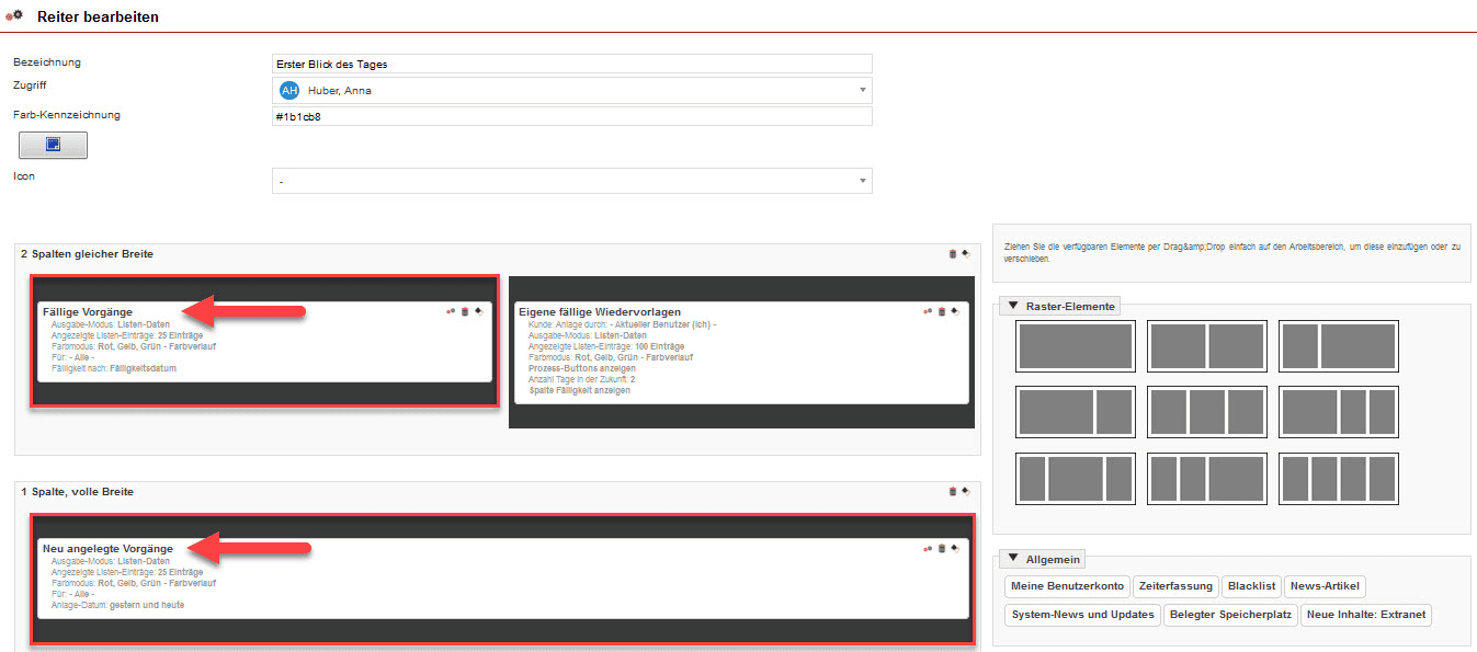 Um Dashboard-Container für Vorgänge zu erstellen, öffnen Sie unter dem Hauptmenüpunkt „Home“ das Dashboard. Klicken Sie rechts oben in der Anzeigemaske auf das Drei-Punkte-Menü und wählen den Menüpunkt „Reiter pflegen“ aus. Im geöffneten Bearbeitungsbereich eines Reiters werden Ihnen schließlich die darin integrierten Container angezeigt. Ziehen Sie eines der rechts dargestellten Raster-Elemente nach links und wählen anschließend den entsprechenden Inhalt aus, indem Sie auch diesen nach links in das gewünschte Raster-Element ziehen.