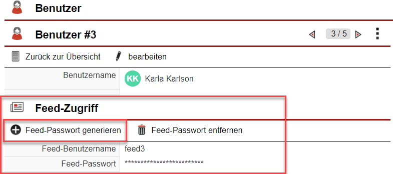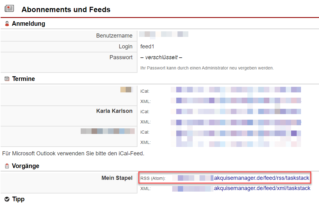 Nachdem Sie diesen Link in Ihrem RSS-Reader eingegeben haben, fragt Sie dieser nach Ihrem Benutzernamen und Passwort. Um diese aufzurufen, begeben Sie sich im Menüpunkt „Einstellungen“, „Berechtigungen“, „Benutzer“ in den Benutzereinstellungsbereich des jeweiligen Mitarbeiters, dessen Vorgangsstapel als RSS-Feed angezeigt werden soll. Klicken Sie im Bereich „Feed-Zugriff“ auf die Schaltfläche „Feed-Passwort generieren“. In der daraufhin erscheinenden Box wird Ihnen nun der Log-In-Name und das Passwort dargestellt. Beachten Sie, dass aus Sicherheitsgründen nur in dieser Infobox das Kennwort einmalig als Klartext angezeigt wird. Speichern Sie sich dieses nicht separat ab, so ist es erforderlich, über den gleichen Button ein neues Passwort zu erstellen, sollte nochmals eine Eingabe nötig sein.