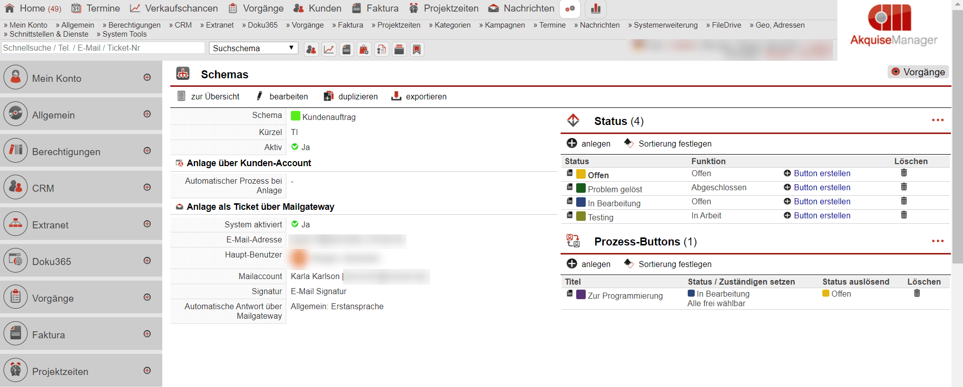 Geben Sie in der Schnellsuchleiste „Vorgänge“ ein und wählen Sie danach im Untermenü den Punkt „Schemas“ aus. Klicken Sie dort auf „anlegen“. Verpassen Sie dem Schema einen passenden und prägnanten Namen, wie etwa „Kundenauftrag“. Durch ein Kürzel und eine Farbkennzeichnung gelingt es Ihnen später besser, sofort das passende Schema auszuwählen. Über „bearbeiten“ können Sie nun das Ticketsystem aktivieren. Wählen Sie dort nun den Hauptnutzer, den Mailaccount sowie die jeweilige E-Mail-Signatur aus. Nachrichten die automatisch über das Ticketsystem versendet werden, greifen auf diese Einstellungen zurück. In diesem Fall soll der Hauptnutzer des Schemas Frau Karlson sein und von Ihrem Mailaccount versendet werden. Der Kunde erhält später also Nachrichten mit dem Absender „Frau Karlson“ und von ihrer E-Mail.