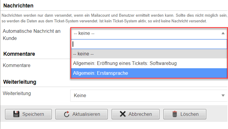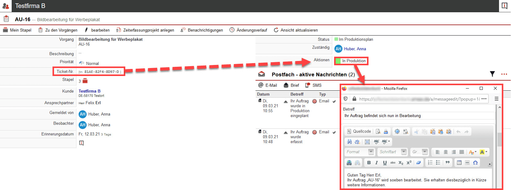 Sofort danach erstellt Herr Mustermann aus dem Vorgang heraus ein Ticket. Systemseitig wird nun eine Ticketnummer vergeben, mit der später eine bessere Zuordnung möglich ist.
