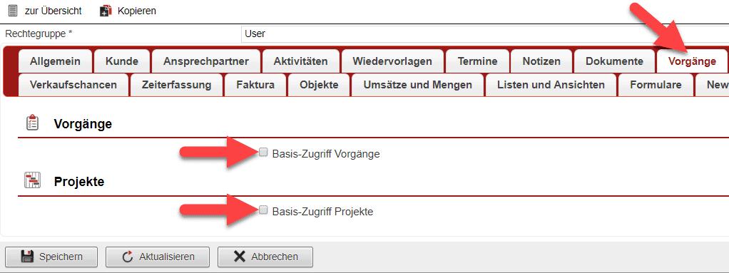 Geben Sie in die Schnellsuchzeile das Stichwort „Rechtegruppen“ ein und klicken den vorgeschlagenen Systemeinstellungspunkt an. Wählen Sie im sich darauf öffnenden Fenster z. B. die Rechtegruppe („einfache“) „User“ aus und begeben sich dort zum Reiter „Vorgänge“. Hier können Sie über zwei Checkboxen festlegen, ob dieser Rechtegruppe grundsätzlich das Recht zum Arbeiten mit einzelnen Vorgängen oder ganzen Projekten gewährt werden soll (siehe „Rechtegruppen“)