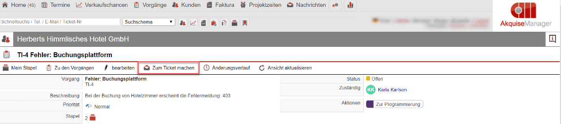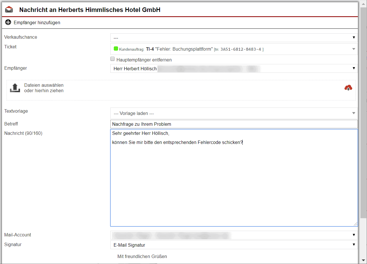 Anhand folgenden Beispiels wird die Arbeitsweise innerhalb des Ticketsystem deutlich. Herr Mustermann bekommt eine Anfrage von seinem Stammkunden, der „Herberts Himmlisches Hotel GmbH“. Seit kurzem taucht bei der Buchung eines Zimmers eine Fehlermeldung innerhalb des Buchungssystems auf.