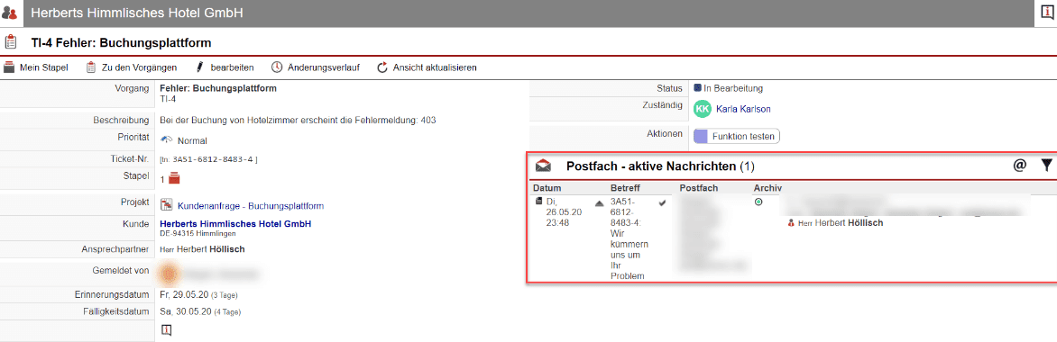 Herr Mustermann übergibt das Ticket nun mit nur einem Klick an Karla Karlson, die sich ab sofort um die Lösung des Problems kümmern soll. Er setzt dabei ein Erinnerungs- und Fälligkeitsdatum, sowie eine besonders hohe Priorität, sodass der Auftrag pünktlich umgesetzt wird. Frau Karlson bekommt die neue Aufgabe nun in Ihren persönlichen Stapel eingesetzt und sieht dort, dass sie das Problem der Buchungsplattform beheben muss. Durch das angelegte Ticket hat sie alle Informationen im Blick und kann ohne lange Rückfragen mit Ihrer Arbeit beginnen. Von der Programmierung, über den Test der Buchungsplattform, bis hin zur endgültigen Lösung wird das Projekt nun im Ticket abgebildet.
