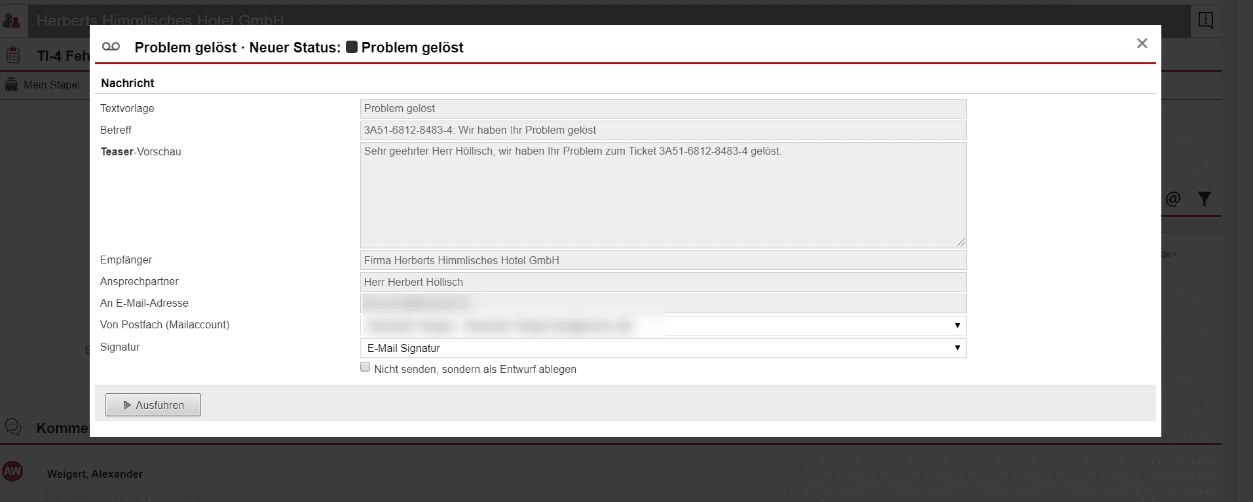 Schon bald hat Frau Karlson den Fehler identifiziert und behoben. Nach einem kurzen Test, ob die Buchungsplattform wieder reibungslos funktioniert, schließt Sie das Ticket, indem Sie auf den Prozess-Button „Problem gelöst“ klickt. Es öffnet sich eine Maske, welche die entsprechende Bestätigungsmail für den Kunden anzeigt. Diese voreingestellte Nachricht wird ihm automatisch geschickt, sobald das Ticket geschlossen wird, da in den Einstellungen des Prozess-Buttons die entsprechende Funktion aktiviert wurde.