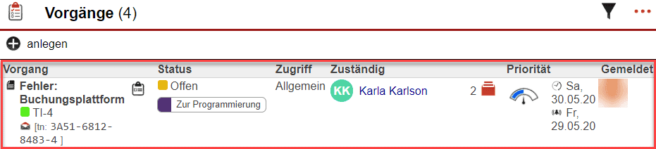 Im Hauptmenüpunkt „Vorgänge“ unter „Vorgänge“ werden sämtliche Tickets dargestellt. In diesem Bereich erfahren Sie zu jedem Ticket