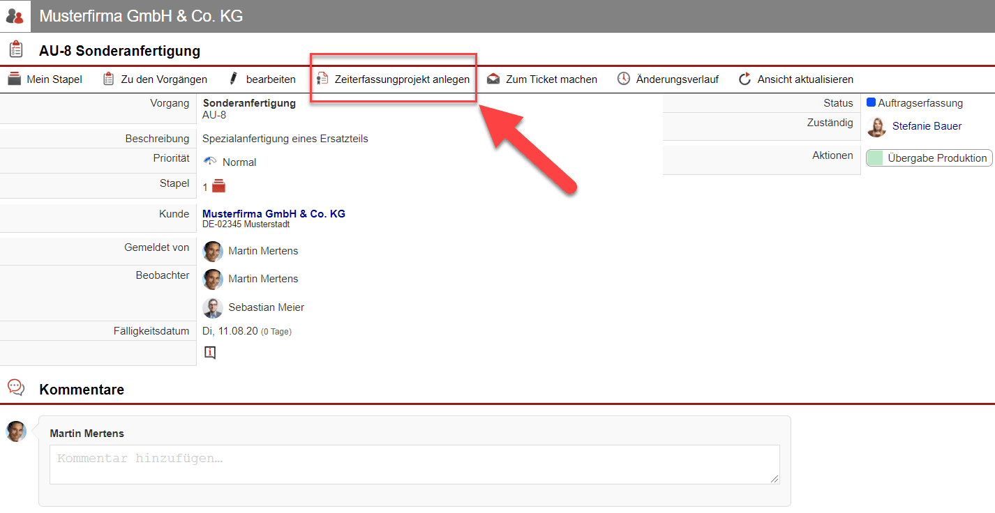 - Legen Sie Zeiterfassungsprojekte direkt in zugehörigen Vorgängen an