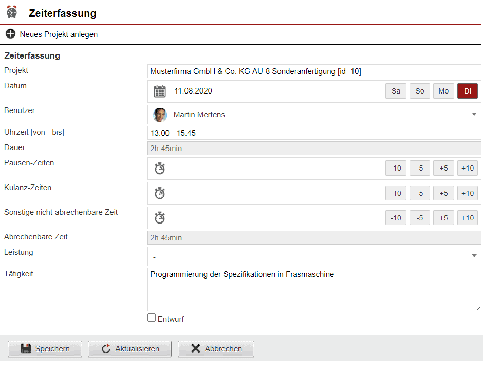 Klicken Sie in der Vorgangsmaske auf „Zeiten buchen“, so öffnet sich das dafür vorgesehene Eingabefenster aus der Projektzeiterfassung. Der automatisch erstellte Name des Zeiterfassungsprojekts ist darin bereits hinterlegt. Machen Sie hier Ihre Eingaben und speichern Sie das Ergebnis ab.