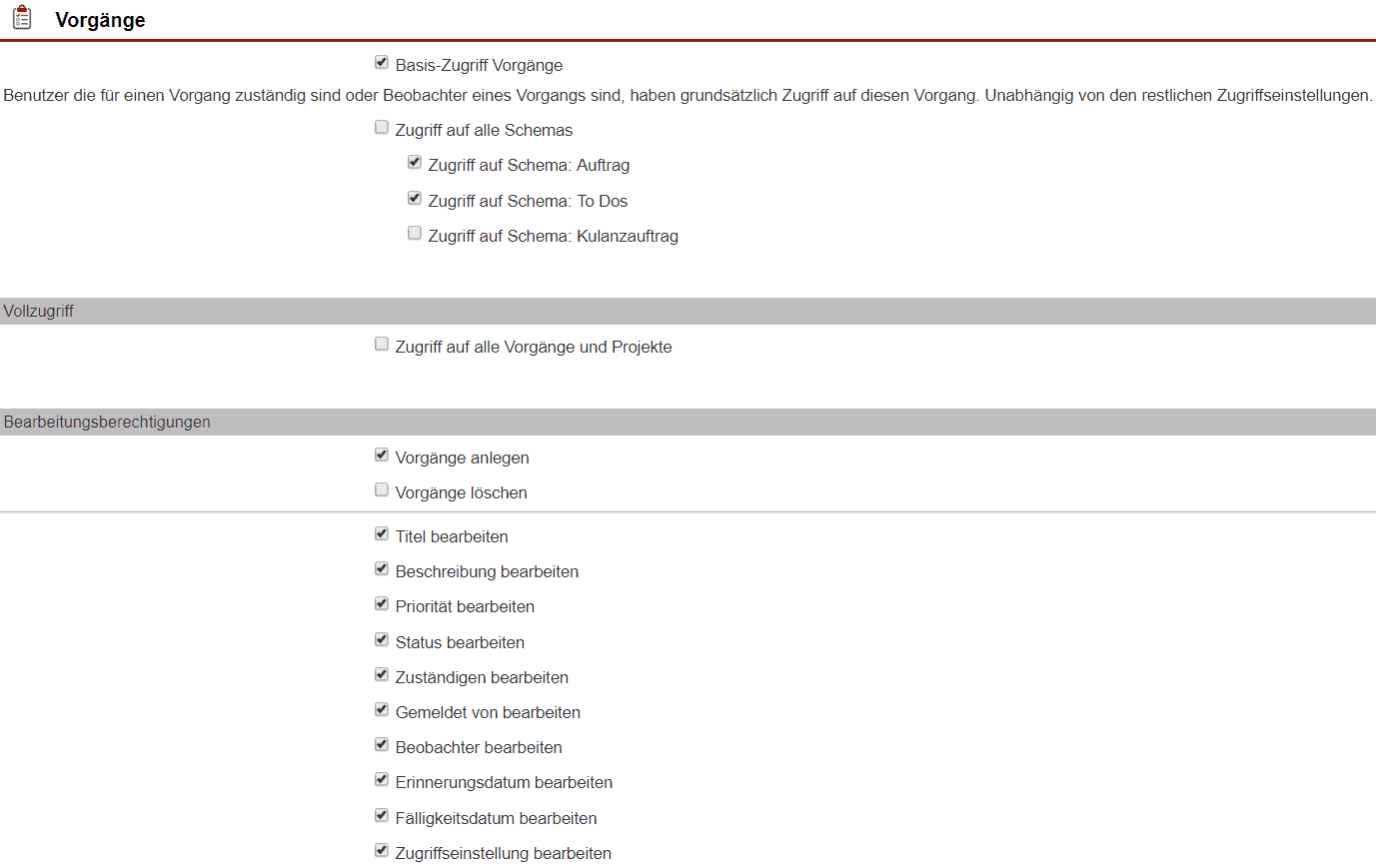 Aktivieren Sie den Basis-Zugriff für Vorgänge, so erscheinen detaillierte Einstellungsmöglichkeiten. In diesen bestimmen Sie, welche angelegten Bearbeitungsschemas ein User verwenden darf, ob er Zugriff auf alle Vorgänge/Projekte hat, nicht nur auf die, in die er selbst involviert ist. Ebenso stellen Sie hier die Bearbeitungsberechtigungen, wie z. B. Anlegen oder Löschen, ein.