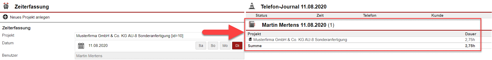 Profitieren Sie vom direkten Bezug zwischen Vorgang und Zeiterfassungsprojekt, ohne erst eine gedankliche Verbindung über eine Kundendatensatz herstellten zu müssen, dem das Zeiterfassungsprojekt zugeordnet ist. - Sehen Sie sowohl im Vorgang als auch im Zeiterfassungsprojekt die Zugehörigkeiten