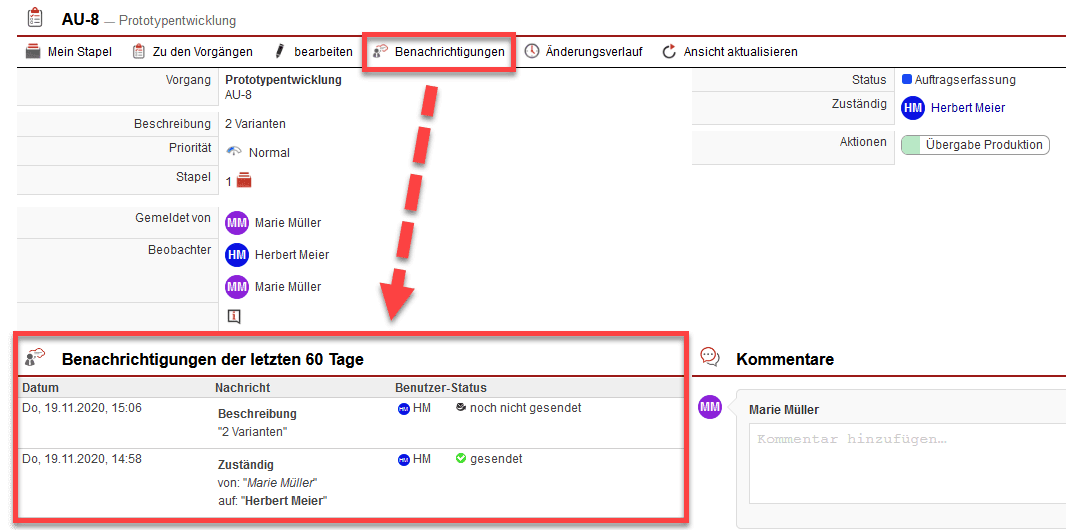 Die Kommentarfunktion bei Vorgängen