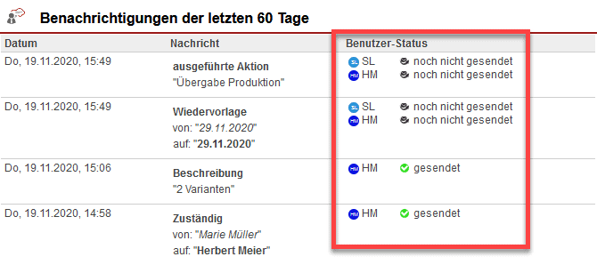 Wie in [Abb. 43] dargestellt, kann es auch sein, dass Benachrichtigungen noch nicht versendet wurden. Hierbei ist zu wissen, dass das System ca. 5 Minuten bis zum tatsächlichen Versand wartet, wodurch vermieden wird, dass zu viele Einzelnachrichten hintereinander verschickt werden. Folglich können zuerst auch einige Nachrichten gesammelt werden, um nach ein paar Minuten eine Gesamtmail mit allen aufgelaufenen Nachrichten zu verschicken. Dies können Sie ebenso dem Benachrichtigungsverlauf entnehmen.