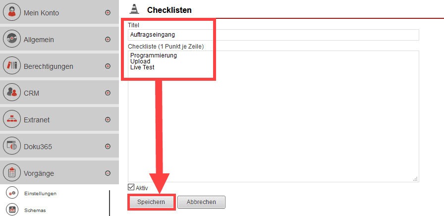 Öffnen Sie unter „Einstellungen“ den Bereich „Vorgänge“. Unter dem Punkt „Checklisten“ lassen sich Checklisten erstellen, die zentral hinterlegt werden und mit nur einem Klick im Vorgang ausgewählt werden können.