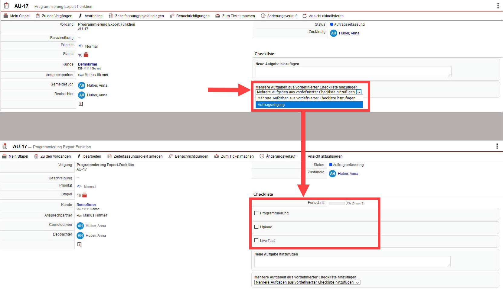 Um eine zentrale Checkliste in einen Vorgang zu integrieren, wählen Sie im Drop-Down-Menü die gewünschte Checkliste aus. Daraufhin wird diese automatisch erstellt.