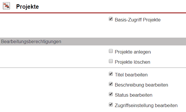 Auch nach der Aktivierung des Basis-Zugriffs auf Projekte erhalten Sie weitere Optionen, mit denen Sie die Bewegungsfreiheit der Mitglieder einer Rechtegruppe beeinflussen können.