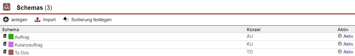 Tipp: Die Grundgerüste fertiger Schemas können auch exportiert und importiert werden. Entsprechende Schaltflächen finden Sie sowohl in der Übersichtsmaske der angelegten Schemas, als auch in der Einrichtungsmaske eines einzelnen. Nach dem Import müssen gegebenenfalls die Prozess-Buttons mit den jeweils für einen Status zuständigen Mitarbeitern versehen werden, falls das Schema aus einem externen System übernommen wurde.