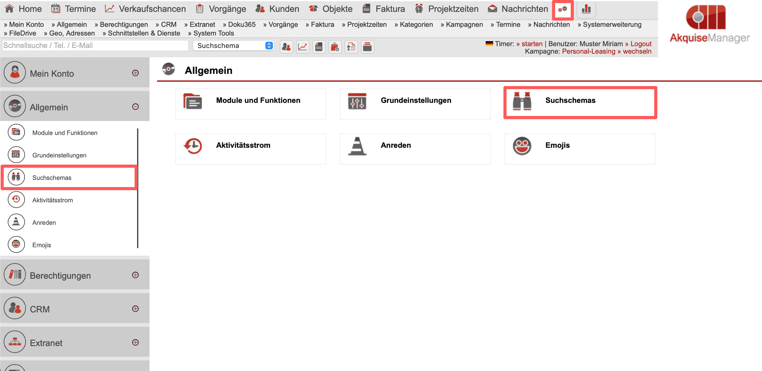 Im Hauptmenüpunkt „Einstellungen“ finden Sie nach einem Klick auf den Untermenüpunkt „Allgemein“ den Bereich „Suchschemas“, in dem erstelle Suchschemas angezeigt werden. Sie öffnen diesen durch einen Klick auf das gleichnamige Icon.
