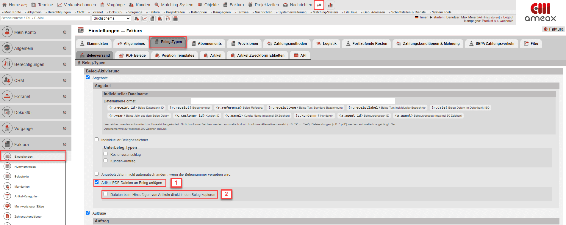 Aktivieren Sie die Checkbox „Artikel PDF-Dateien an Beleg anfügen“, um die Dokumente dem Beleg hinzuzufügen [Abb. 1/1]. Setzen Sie den Haken in der Checkbox „Dateien beim Hinzufügen von Artikeln direkt in den Beleg kopieren“, so bewirken Sie, dass zusätzlich zum Einfügen in den Beleg die Dateien auch in der Erstellung des Beleges gesondert als Anhänge nochmal aufgeführt werden.