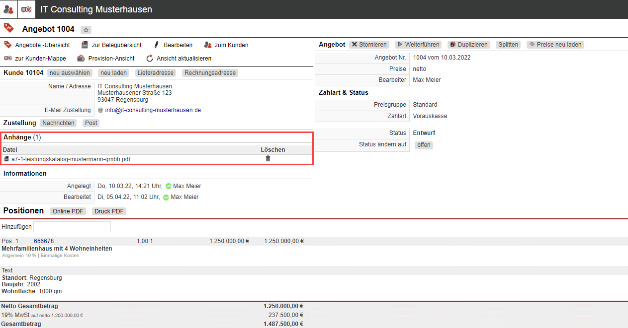 Ein Beleg könnte wie im Beispielbild oben aussehen. Hier wurde ein fiktives Angebot eines Immobilienmaklers nachgestellt. Das Exposé der Immobilie wurde automatisch dem Angebot beigefügt, damit der potentielle Käufer sofort alle benötigten Informationen in nur einem Dokument erhält.