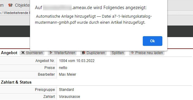 Sie bekommen zudem vom System eine Benachrichtigung, wenn eine Datei-Anlage beim Artikel gefunden und diese im Anhang hinterlegt wurde. Bestätigen Sie dies anschließend mit „Ok“.