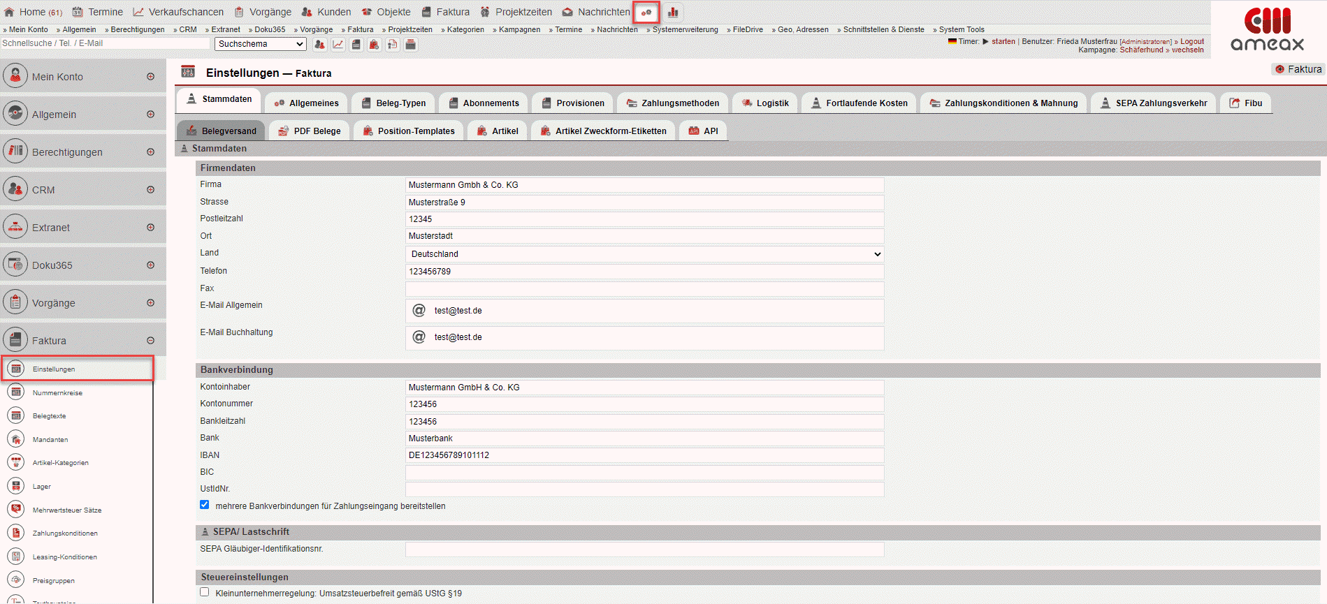 Im Hauptmenüpunkt „Einstellungen“ finden Sie unter „Faktura“ den Bereich „Einstellungen“. In diesem Abschnitt können Sie Grundeinstellungen für die ameax Faktura vornehmen. Die Inhalte der meisten Reiter und Unterpunkte erklären sich erfahrungsgemäß von selbst und werden daher nur kurz behandelt.
