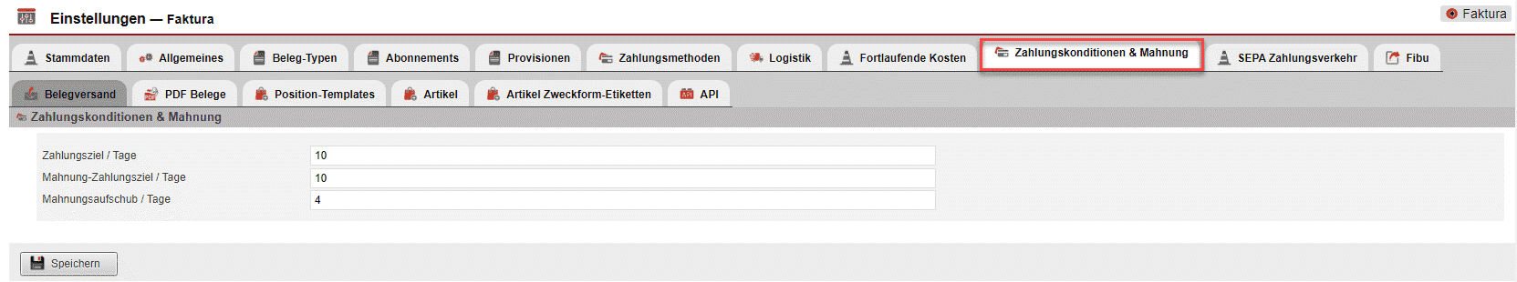 Bei „Zahlungskonditionen & Mahnung“ können Sie die jeweilige Anzahl der Tage des Zahlungsziels hinterlegen. Genauere Informationen finden Sie unter „Einstellungen Mahnwesen“ und „Arbeiten mit dem Mahnwesen“.