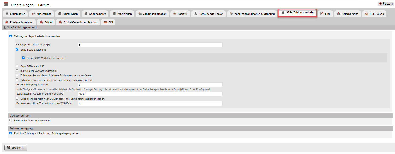 Im Reiter „SEPA Zahlungsverkehr“ werden diesbezüglich Grundeinstellungen vorgenommen. Wenn Sie Zahlungen per SEPA erlauben, aktivieren Sie diese Checkbox. Anschließend können Sie die Einstellungen spezifizieren.