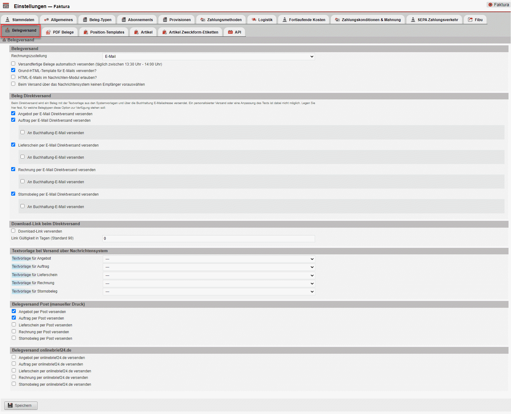 Im Bereich „Belegversand“ stellen Sie Einstellungen bezüglich des Versenden von Belegen ein. Der Inhalt des Reiters ist erfahrungsgemäß selbsterklärend.