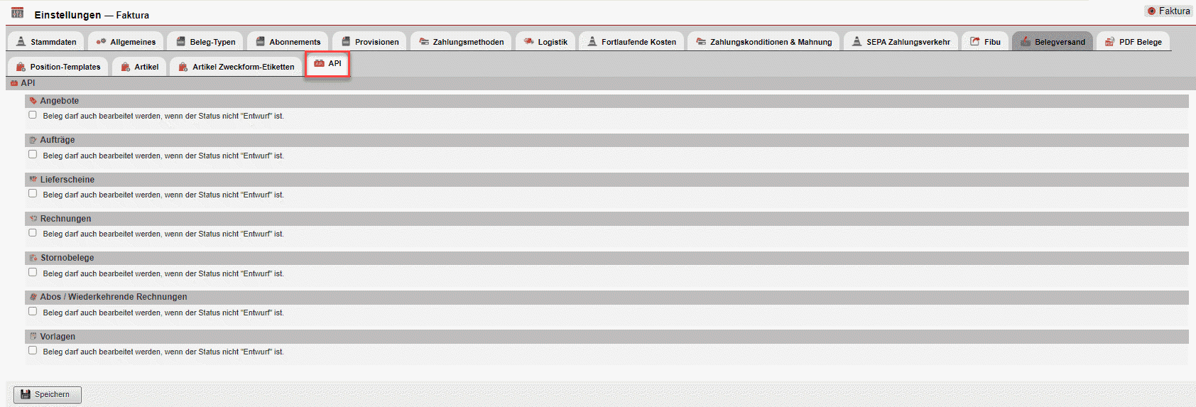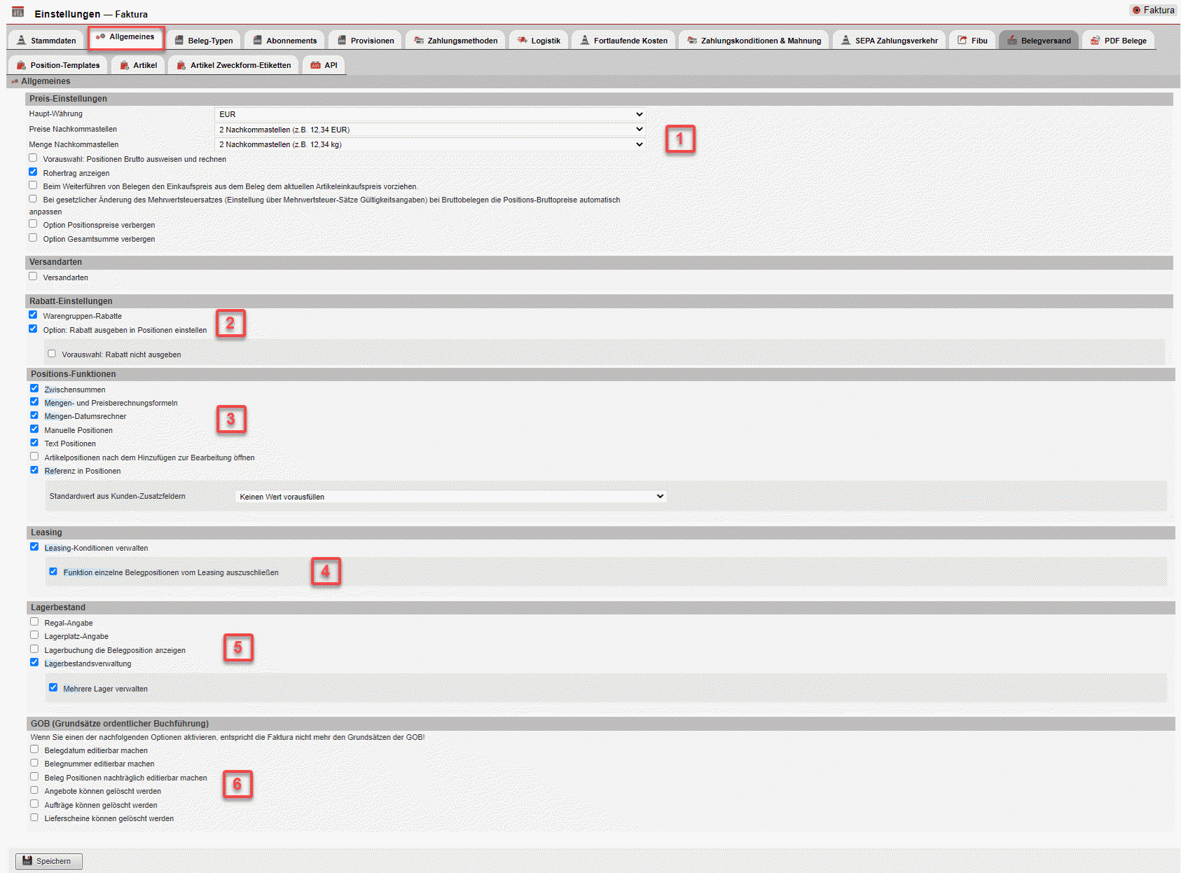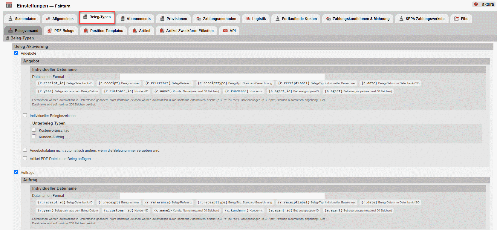 Es können bei „Beleg-Typen“ die zu verwendenden Belege ausgewählt, Einstellungen vorgenommen und deren Abschlusstexte eingerichtet werden.