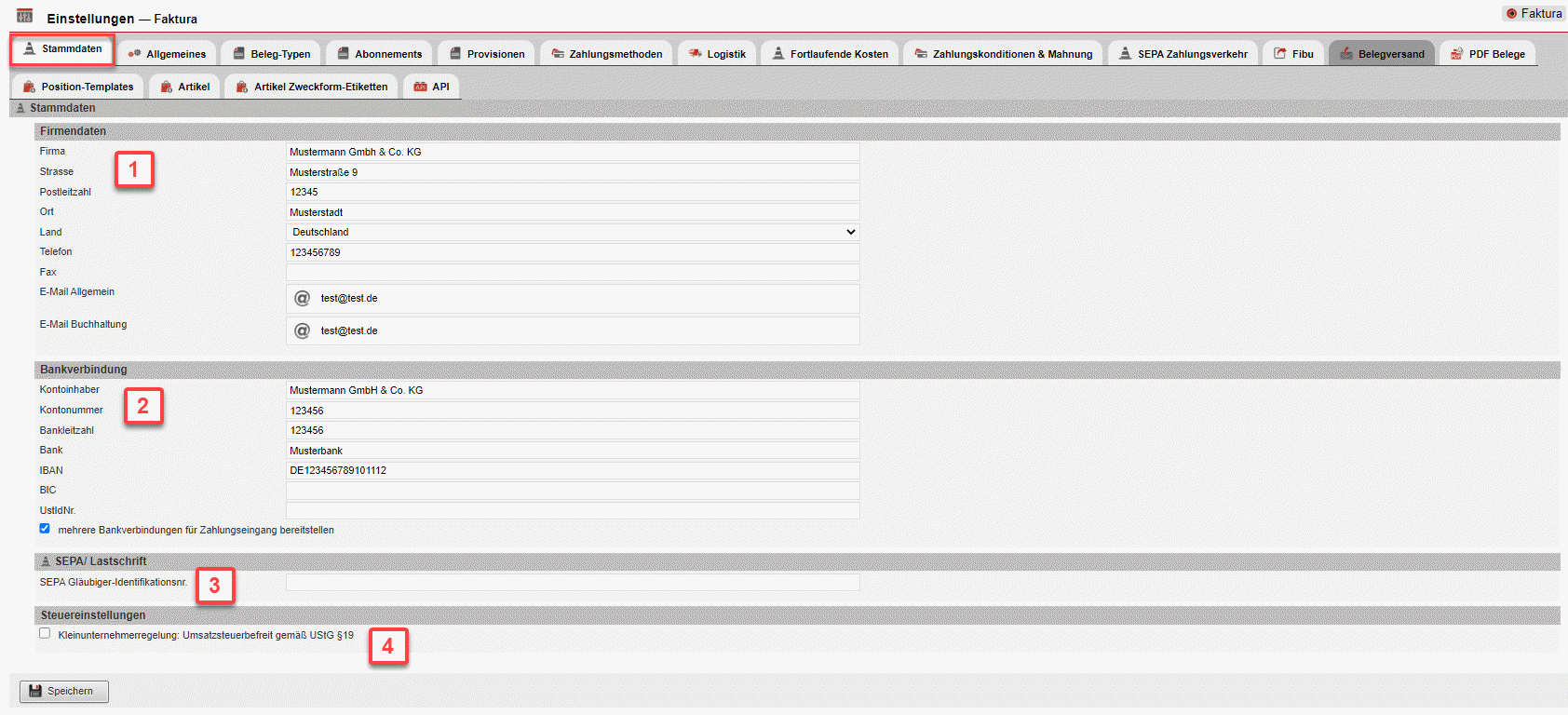 Im Detail werden so bei „Firmendaten“ die allgemeinen Hintergrundinformationen zum Unternehmen aufgeschlüsselt [Abb. 2/1]. Im Bereich Bankverbindung haben Sie die Möglichkeit, eine beziehungsweise mehrere Bankverbindungen zu hinterlegen [Abb. 2/2]. Unter „SEPA/Lastschrift“ wird die SEPA Gläubiger-Identifikationsnummer eingetragen [Abb. 2/3]. Im letzten Abschnitt des Reiters „Stammdaten“ können Sie durch das Aktivieren der Checkbox, „Kleinunternehmerregelung: Umsatzsteuerbefreit gemäß UStG §19“ einstellen, dass bei Provisionsausschüttungen oder Gutschriften festgelegt werden kann, dass deren Empfänger umsatzsteuerabzugsberechtigt ist und ihm ein entsprechend korrekt ausgestellter Beleg ausgestellt werden kann (siehe hierzu „Provisionen“) [Abb. 2/4].