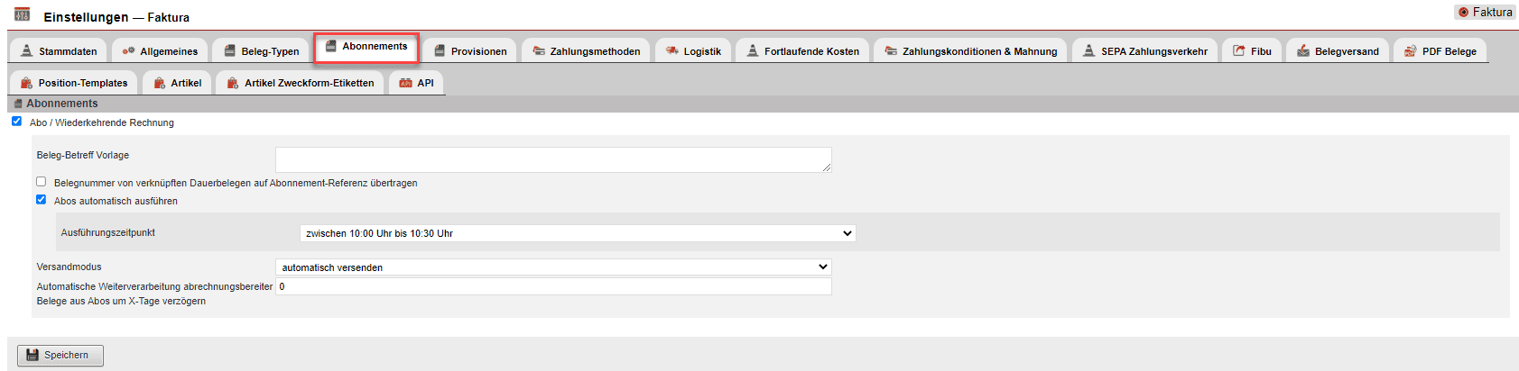 Im Reiter „Abonnements“ können Sie einstellen, ob Sie wiederkehrende Rechnungen im System verwenden wollen. Außerdem wird eingerichtet, ob/wann diese automatisch oder manuell versendet werden sollen.