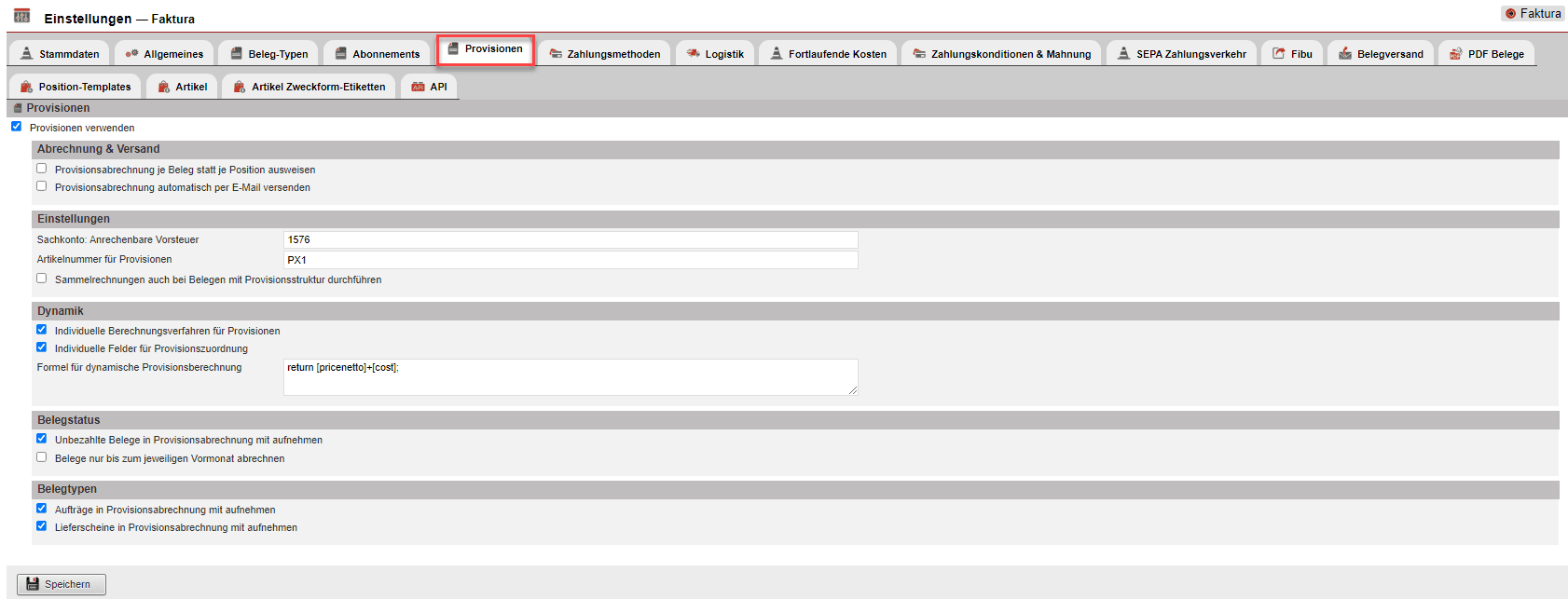 Bei „Provisionen“ wird erstmal grundlegend verwaltet, ob Sie im System mit Provisionen arbeiten möchten. Wenn Sie den Haken in der Checkbox gesetzt haben, können Sie die Einstellungen spezifizieren. Hier empfehlen wir, alle Bereiche in Ruhe anzuschauen und die Eingaben zu tätigen.