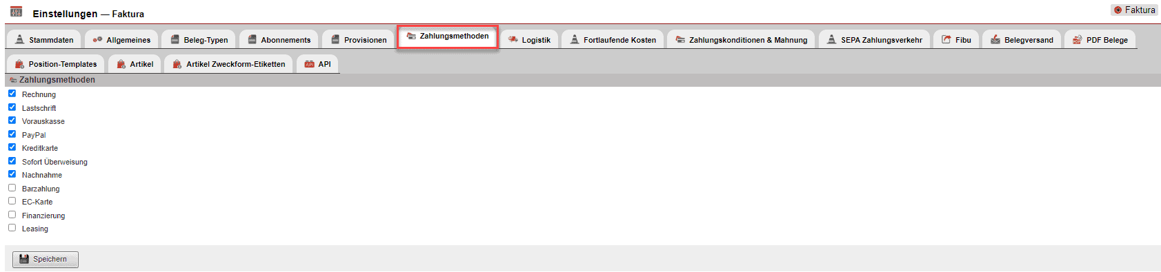 Dieser Abschnitt ist dafür gedacht zu regeln, mit welchen „Zahlungsmethoden“ Sie in Ihrer Firma arbeiten. Nur die gewählten werden Ihnen anschließend als Option für die Zahlung einer Rechnung angeboten.