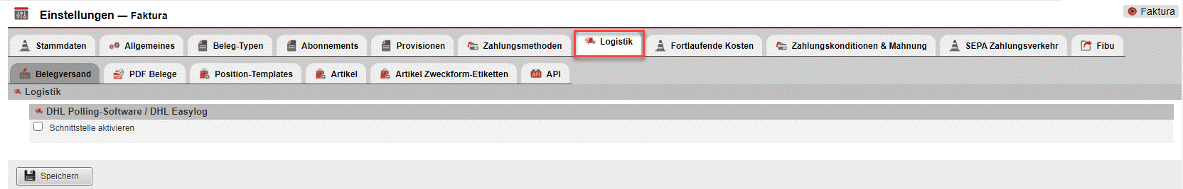 Unter „Logistik“ kann eingestellt werden ob eine Schnittstelle zu „DHL Polling-Software/DHL Easylog“ aktiviert werden soll.
