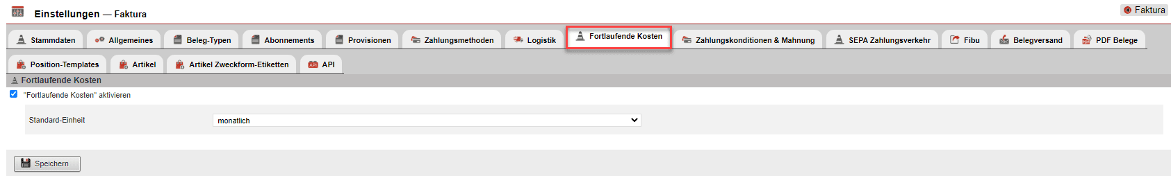 Die Checkbox „Fortlaufende Kosten aktivieren“ steht mit den „Abonnements“ im Zusammenhang. Hier können Sie die Standard-Einheit der Fortlaufenden Kosten eintragen. Da es sich bei den Abos um Wiederkehrende Rechnungen handelt braucht man im Gegenzug die Aktivierung der Fortlaufenden Kosten.
