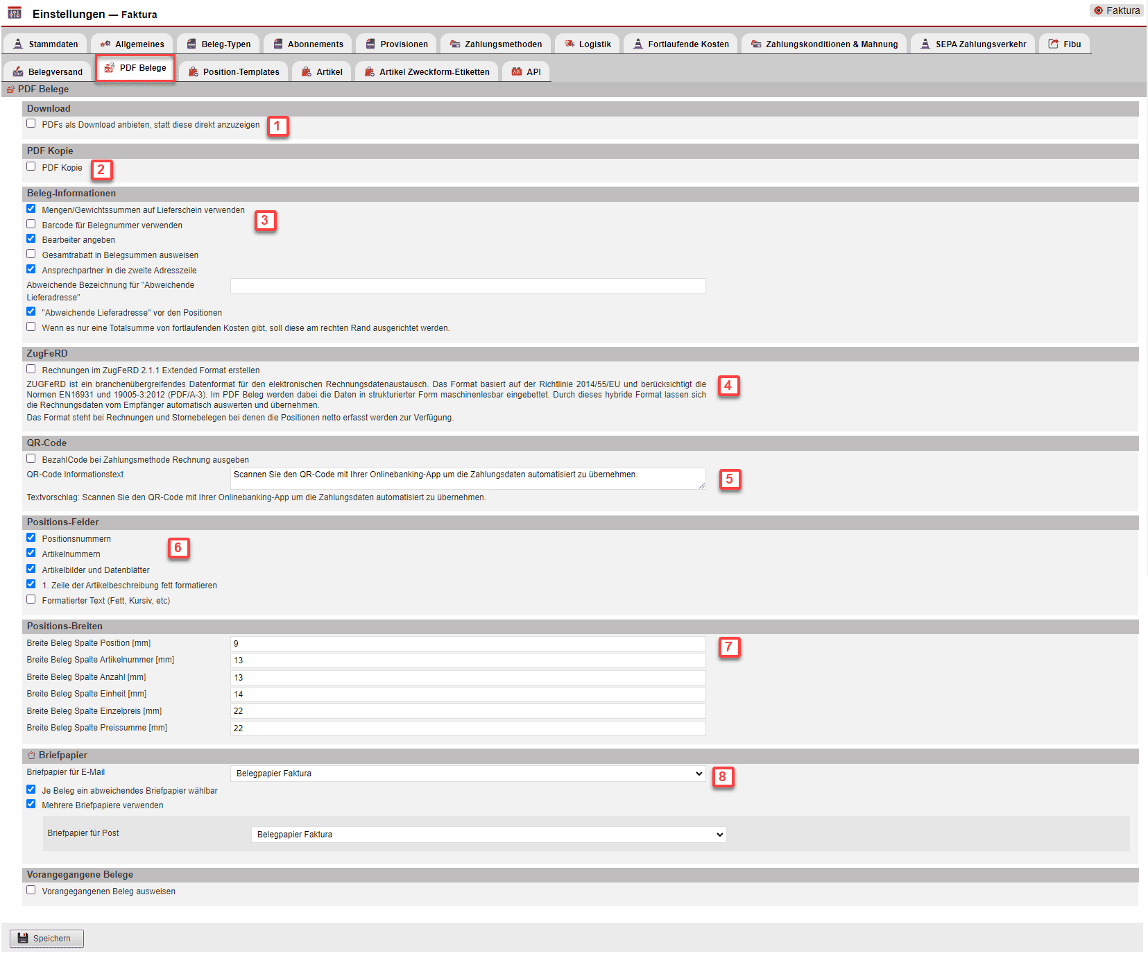 Unter „PDF Belege“ führen Sie alle Grundeinstellungen für Belege in der Faktura durch. Wenn diese zuerst zum Download angeboten werden sollen, anstatt direkt angezeigt zu werden, aktivieren Sie die entsprechende Schaltfläche [Abb. 14/1].