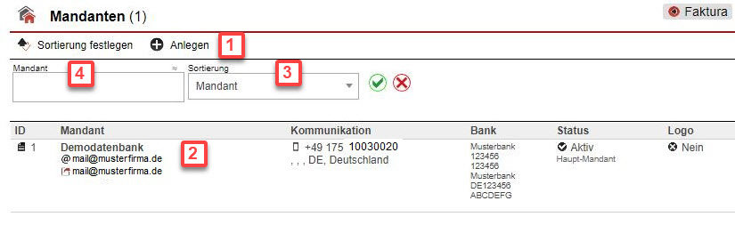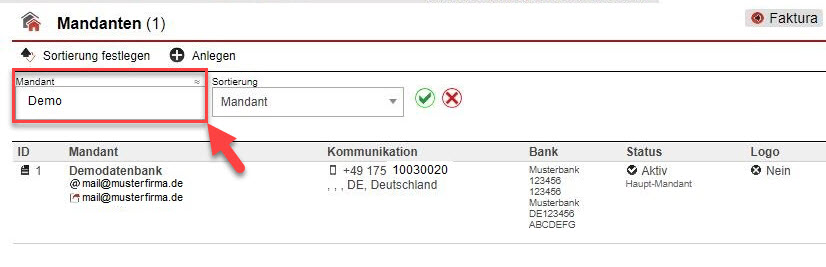 Klicken Sie im Hauptmenüpunkt „Einstellungen“ auf „Faktura“ und wählen Sie im nun geöffneten Menü das Untermenü „Mandanten“ aus, um die für die Fakturierung erforderlichen Mandanten zu bearbeiten.