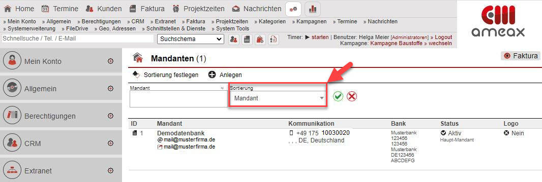 Sortieren Sie die bisher angelegten Datensätze nach „Mandant“ oder „ID“. Klicken Sie dafür auf das Drop-Down-Menü unter „Sortierung“ und wählen Sie zwischen den angezeigten Sortierkriterien aus. Mit einem Klick auf das ausgewählte Kriterium sortiert das System die Datensätze automatisch.