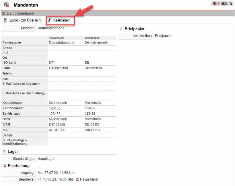 Bestätigen Sie die Änderungen mit dem Button „Speichern“, kehren Sie in den Ansichtsmoduls zurück. Von hier aus können über „bearbeiten“ den Mandanten erneut bearbeiten oder zur Übersicht zurückkehren.