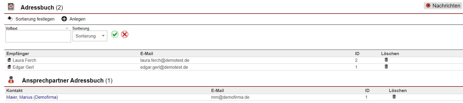 In den Einstellungen unter „Nachrichten“ finden Sie den Bereich „Adressbuch“. Die Übersicht der dort hinterlegten E-Mail-Adressen ist zweigeteilt. Im oberen Teil der Übersicht finden Sie alle manuell hinterlegten E-Mail-Adressen. Unter dem Punkt „Ansprechpartner Adressbuch“ werden sämtliche Ansprechpartner aufgelistet, für welche die Option „In zentralem Adressbuch veröffentlichen“ aktiviert wurde. Die Ansprechpartner werden automatisch in alphabetischer Abfolge sortiert. Über das Papierkorb-Icon lassen sich einzelne Eintragungen aus dem zentralen Adressbuch wieder entfernen.