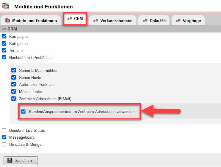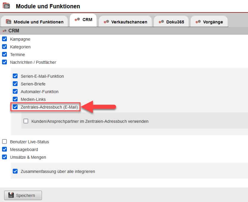 Die Funktion des zentralen Adressbuchs muss vor der Nutzung in den Einstellungen bei „Allgemein“ unter „Module und Funktionen“ im Reiter „CRM“ aktiviert werden. Setzen Sie hierzu bei der Option „Zentrales-Adressbuch“ einen Haken und speichern Sie anschließend Ihre Eingabe.
