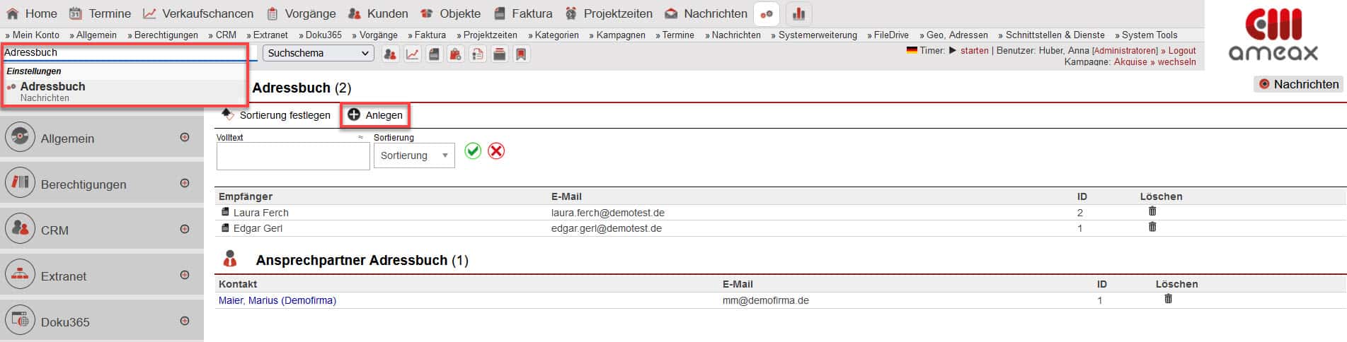 Im zentralen Adressbuch lassen sich E-Mail-Adressen hinterlegen, welche Sie überall in der ameax Unternehmenssoftware für den Versand von Nachrichten verwenden können. Sie finden das zentrale Adressbuch unter „Einstellungen“ bei „Nachrichten“ als gleichnamigen Bereich.