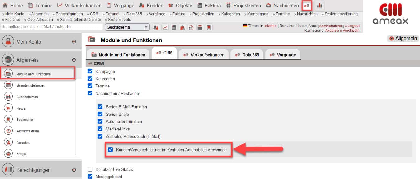 In den Einstellungen unter „Allgemein“ im Bereich „Module und Funktionen“ lässt sich im Reiter „CRM“ eine Funktion aktivieren, welche dafür sorgt, dass im Anlage- bzw. Bearbeitungsbereich von Ansprechpartnern die Option zur Integration des Ansprechpartners ins zentrale Adressbuch angeboten wird.