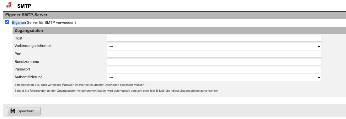 Schließlich müssen Sie noch den Benutzernamen und das Passwort Ihres SMTP-Servers eingeben. Zu beachten gilt, dass das Passwort im Klartext in unserer Datenbank abgespeichert werden muss.