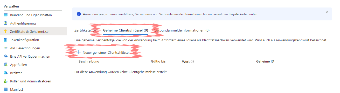 - Für dessen Generierung klicken Sie bitte auf den Menüpunkt „Zertifikate und Geheimnisse“ und wählen in der Übersichtsseite den Button „Geheime Clientschlüssel“ Klicken Sie danach auf „Neuer geheimer Clientschlüssel“.